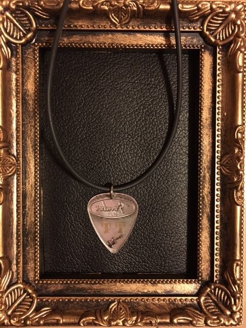 ピックネックレスです。サービスで、ピックの裏面にイニシャル又はお名前を、